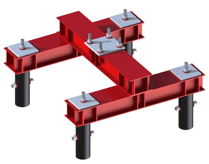 Стальной ростверк обычно монтируется из двутавровых балок или швеллеров – технические параметры конструкции рассчитываются с учетом типа свай, эксплуатационных нагрузок. Изготавливается по типовым сериям и рабочей документации проекта. Для антикоррозийной защиты обычно используется горячая оцинковка.